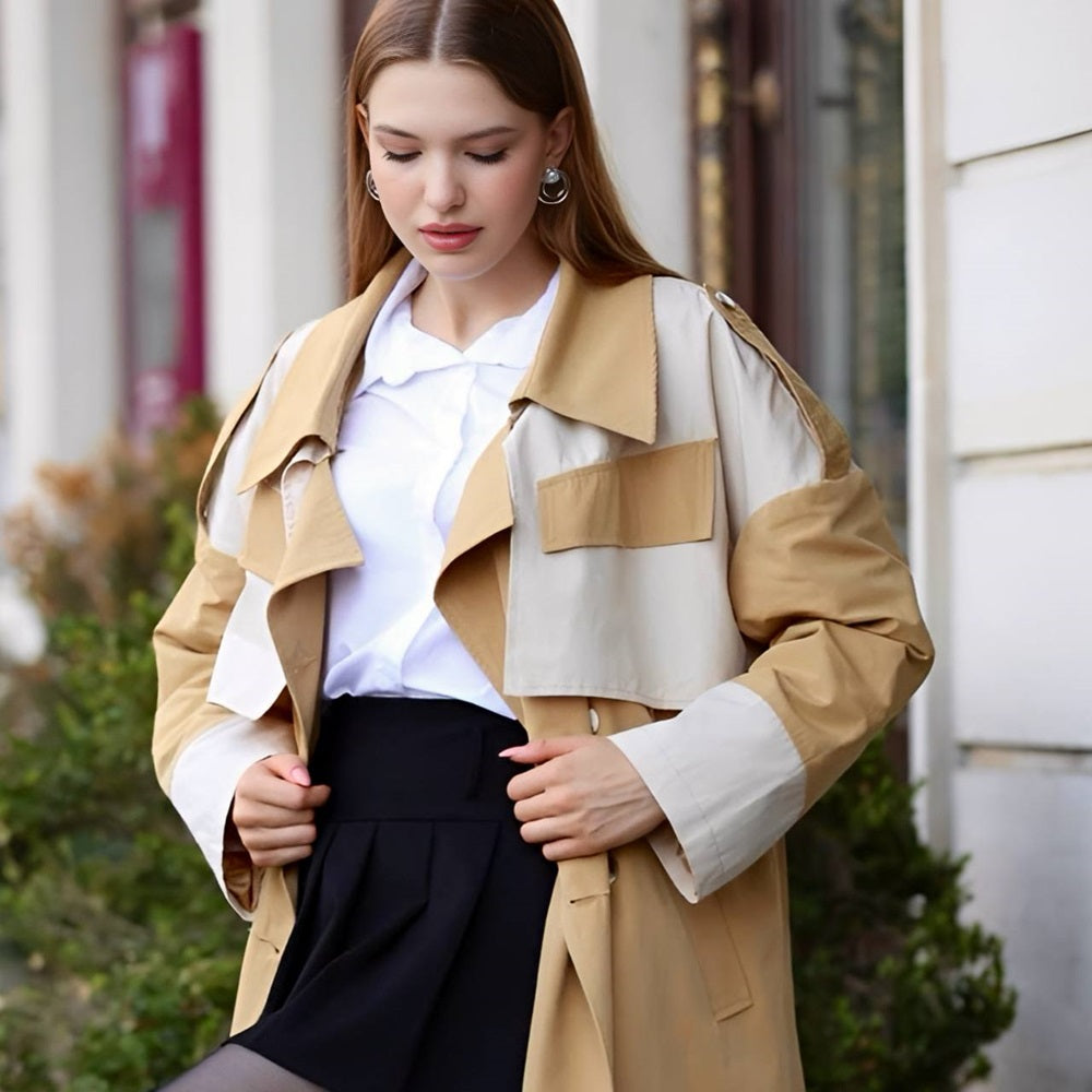 - • التصميم: ترنش كوت أنيق مزيج لونين